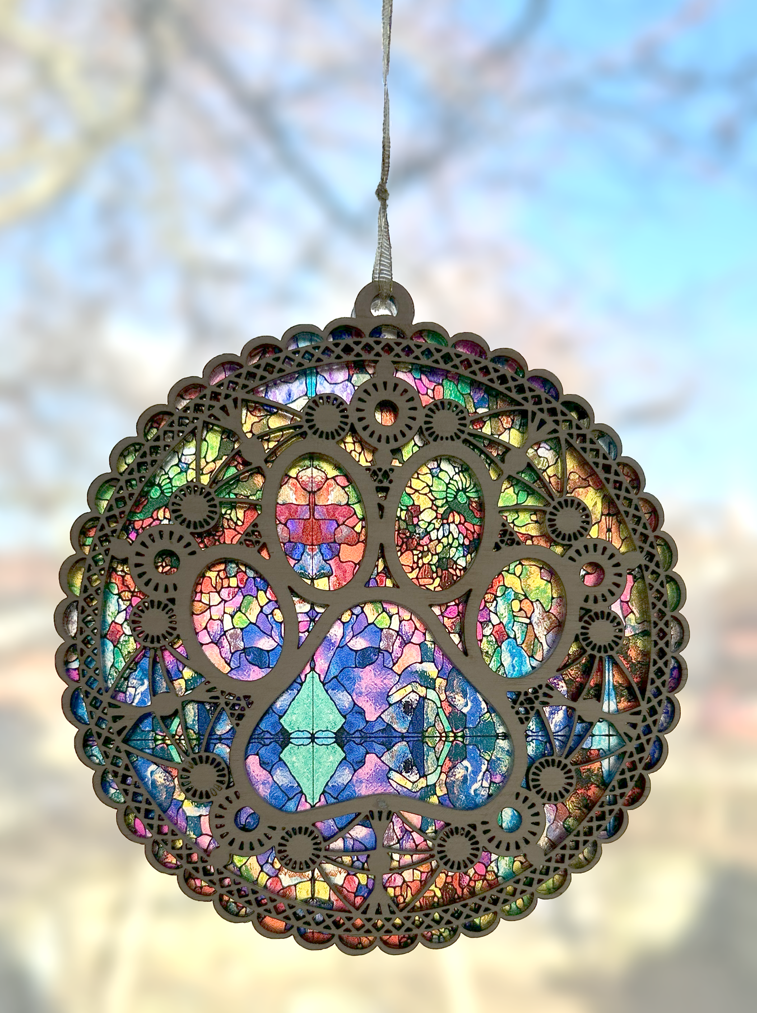 This charming window hanging features a colorful acrylic design nestled between two sturdy 1/8″ plywood layers. It comes with a suction‑cup hanger so you can brighten any window with ease.