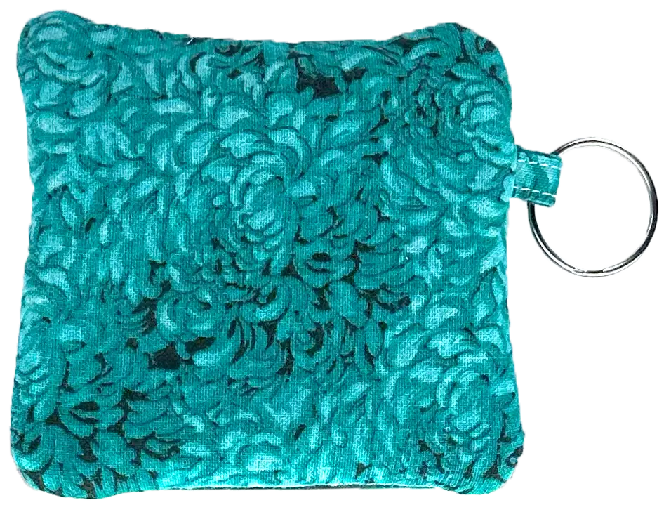 A charming 3″ x 3″ fully lined embroidered coin or accessory pouch, complete with a handy keyring attachment.