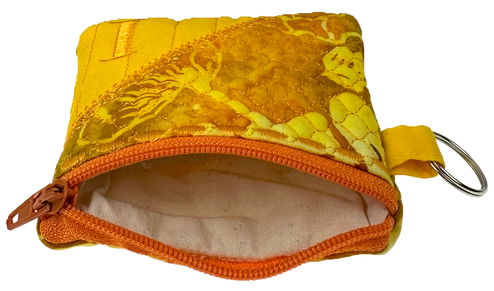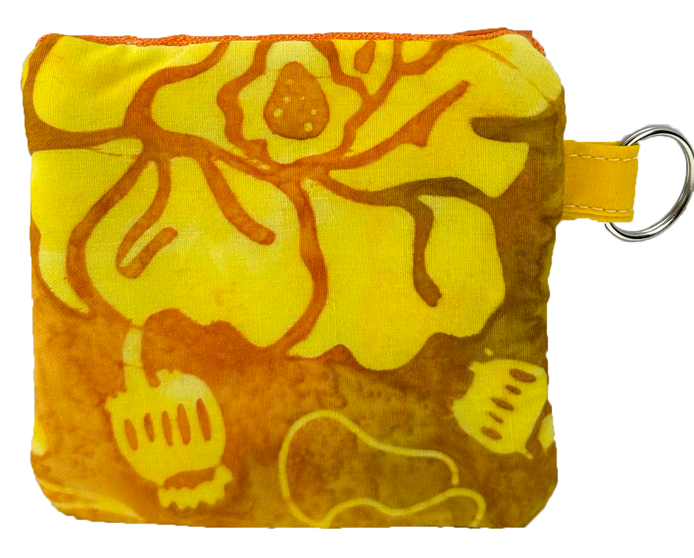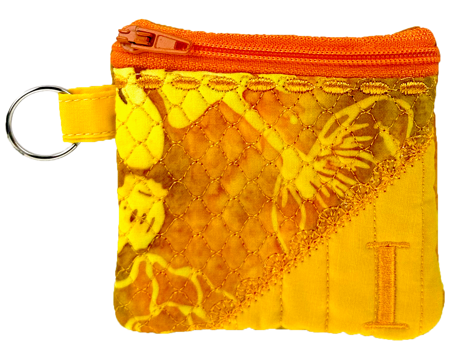 A charming 3″ x 3″ fully lined embroidered coin or accessory pouch, complete with a handy keyring attachment.