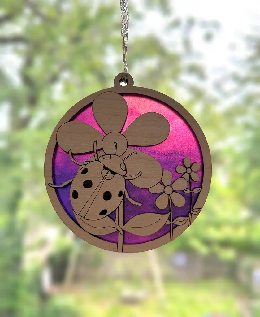 This charming window hanging features a colorful acrylic design nestled between two sturdy 1/8″ plywood layers. It comes with a suction‑cup hanger so you can brighten any window with ease.