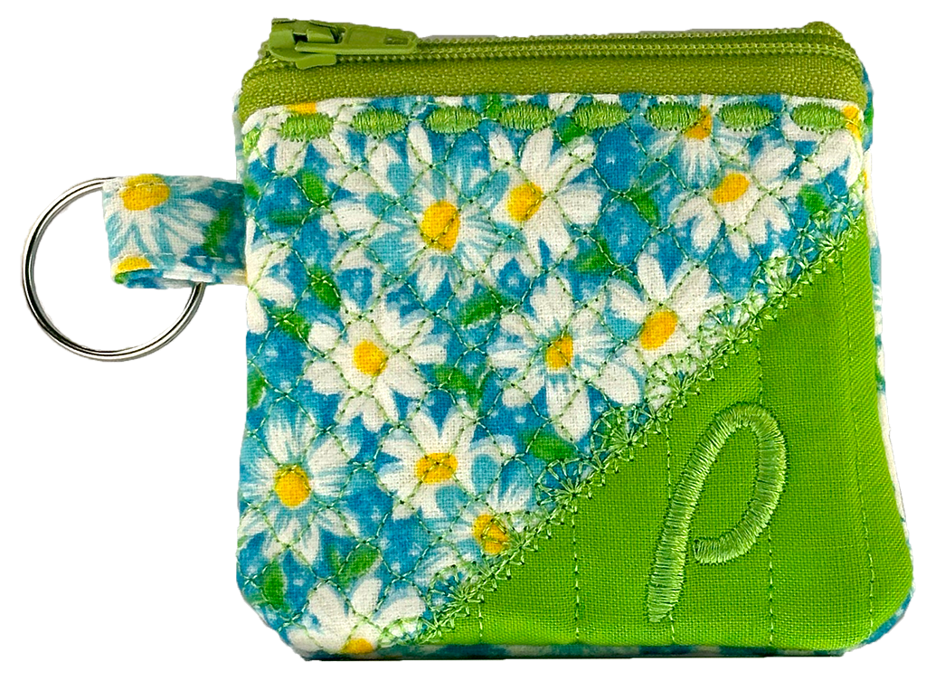 A charming 3″ x 3″ fully lined embroidered coin or accessory pouch, complete with a handy keyring attachment.
