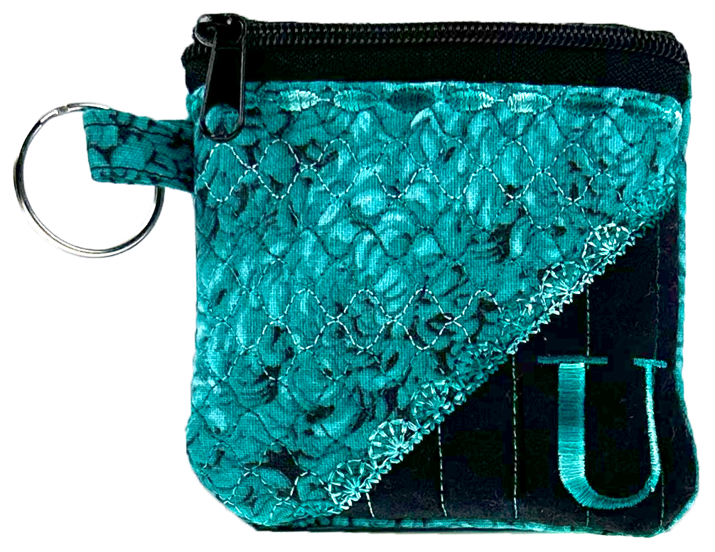A charming 3″ x 3″ fully lined embroidered coin or accessory pouch, complete with a handy keyring attachment.